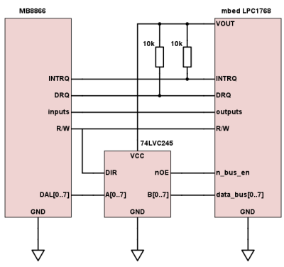 The figure below illustrated how the floppy controller board (“A9 board”, as per the service manual) is connected to the mbed. I used a 74LVC245 as a level shifter on the data bus to do a tidy job for once. Level shifting isn't needed on any other signals because the MB8866 is happy with 3.3V logic levels at its inputs and its only other two outputs to the mbed are open collector, which are pulled up to 3.3V.