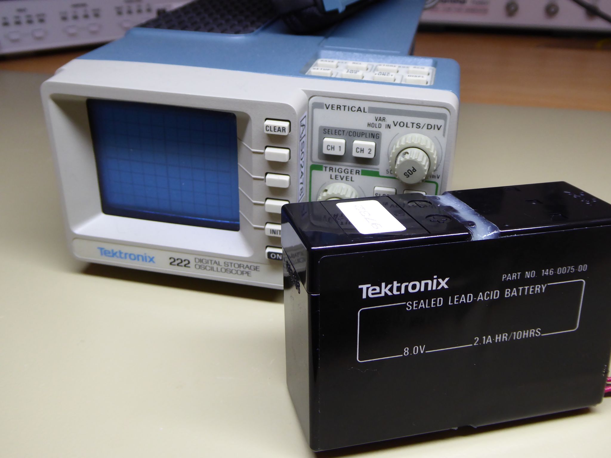 Aeons ago, the Tektronix 222 and its friends (such as the 224 and several variants thereof) were released upon the world. These are adorable little battery-powered digital scopes which may not be a match for modern portable scopes, but can still be quite useful. They are powered by an 8V sealed lead-acid battery, for which replacements stopped being manufactured a long time ago.