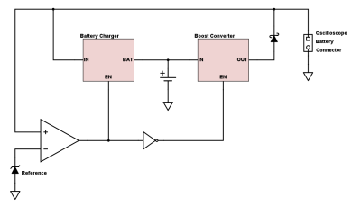 The oscilloscope features a low-voltage cut-out at about 7.5V - if the battery voltage drops below that, the oscilloscope shuts off to prevent overdischarge of the battery. However, in this architecture a constant 8V is supplied to the scope regardless of actual battery voltage, so the scope can't take care of protecting the battery any more.